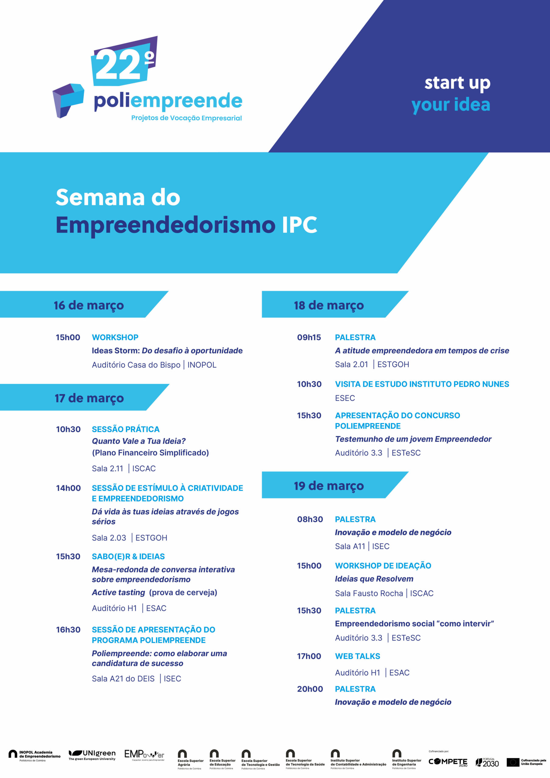De 16 a 19 de março de 2026, será dada à comunidade do Politécnico de Coimbra (IPC) a oportunidade de participar em 13 atividades gratuitas, incluindo palestras, workshops, mesas redondas, webinars e visitas a empresas/organizações, distribuídas pelas 6 Unidades de Ensino do Instituto.